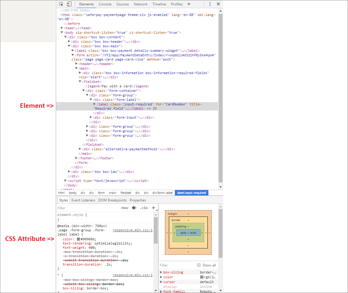 Element Attribute: Element attributes should not be used, because attributes (name, value, data-*, etc.) can change without notice.