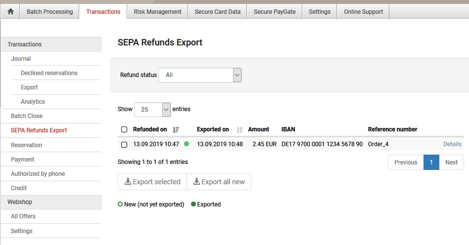 These refunds need then to be exported into a special XML-File, which can be done right there inside the Backoffice. The created XML-file can then be uploaded into your online banking-portal, which executes these refunds in a batch, eliminating the need, of doing them all manually.