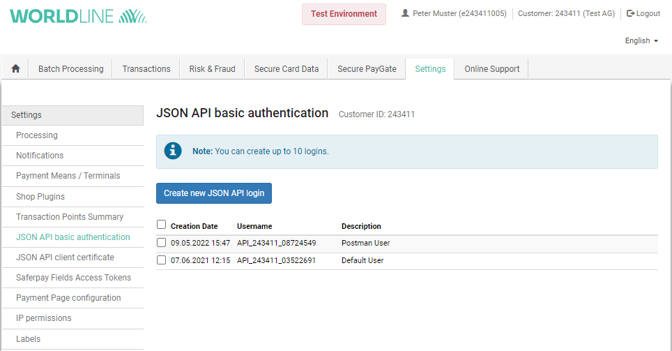Für Benutzername und Kennwort verwenden Sie die Angaben unter **JSON API** aus der E-Mail vom Saferpay-Testkonto oder direkt aus dem Saferpay Backoffice.
